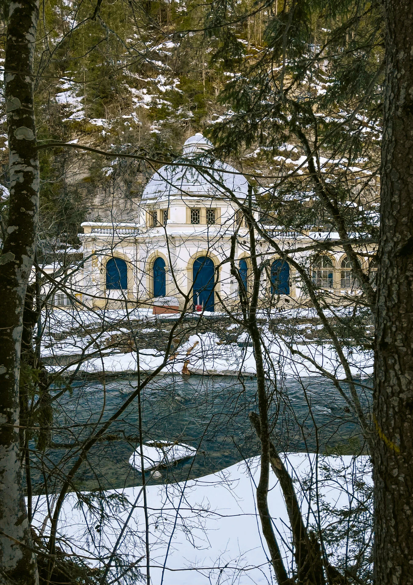 Gerade checkt ein Paar mit grossen Rollkoffern im Hotel ein. Im offenen Barbereich sitzen zwei Gäste in bequemen Fauteuils, trinken Tee und lesen Zeitung. Die meisten stehen im nahen Wintersportgebiet Motta Naluns auf ihren Skiern. Lea Hummel lehnt an der Bar und wirkt müde. Sie hat gerade eine dreistündige Sitzung hinter sich und braucht erst einmal einen Espresso. Dann zieht sie eine graue Flauschjacke über, nimmt zwei leere Wasserflaschen und macht sich auf den Weg zur Chasa Carola. Die Trinkhalle am Inn birgt die Fassung der gleichnamigen Quelle und steht das ganze Jahr rund um die Uhr offen. Die Quelle wurde durch Zufall entdeckt, als 1858 eine erste holzgedeckte Brücke über den Inn gebaut wurde.
