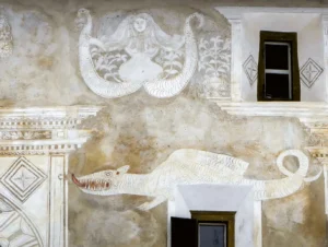 Hausfassade in Cinuos-chel: Die Nixe symbolisiert die Göttin des Inns oder der Maira. Auch der Drache steht symbolisch für den Inn. (Bild: Alex Winiger/mural.ch, 2019)